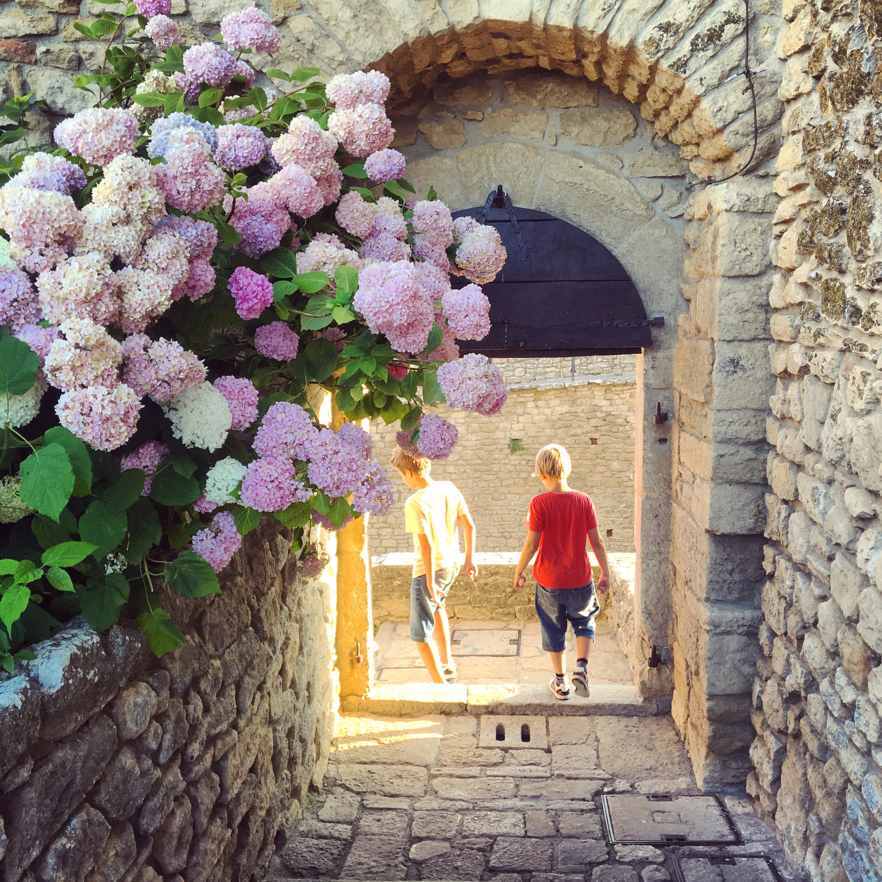 Minstingen har ett par Euro på fickan som han använder till att stoppa i en sån där stationär kikare att studera landskapet med. Vi strosar runt lite, klättrar upp för någon trappa i ett torn. Strosar på en avsats längs en av murarna. Hittar en liten konstutställning. Men tolvåringen vilar sig mest i skuggan. Kanske håller han på att bli förkyld?
