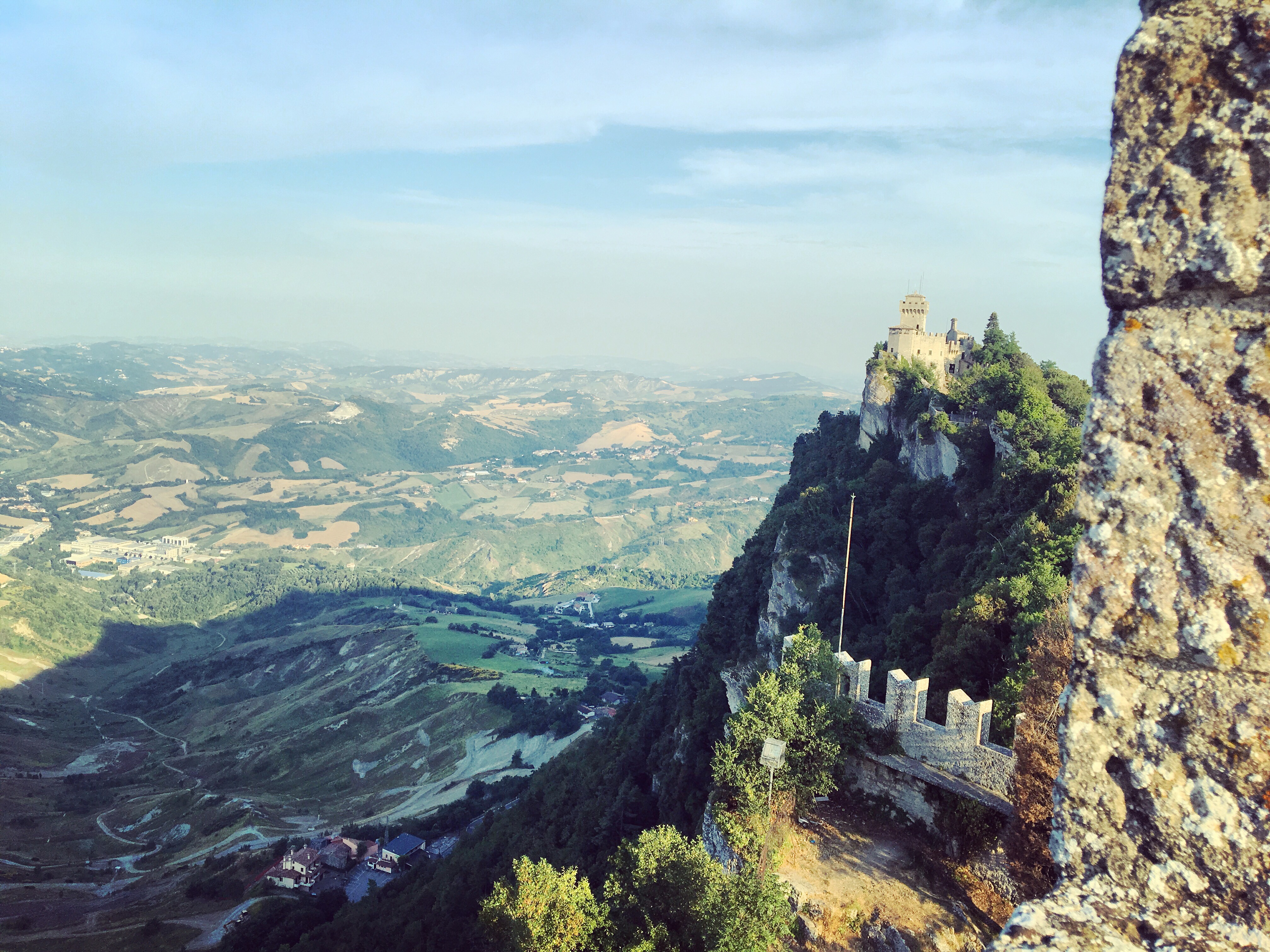 Vi står och beundrar utsikten från en av San Marinos borgar, Torre Guaita. Det är från 1000-talet och ska ha varit fängelse ända till 1970-talet. Nu är det museum. Vi kom in precis innan de stängde entrén. Jag fick i vart fall det intrycket av att kvinnan i biljettluckan såg skeptisk ut frågade: ”Är ni kvar i San Marino imorgon också?” när vi ville lösa biljett. Först när vi svarade nekande på den frågan avslöjade hon biljettpriset. Vi har med oss rabattkort vi fått på hotellet och när jag får biljetterna som är stadiga kort i hårdplast i kontokortsstorlek anar jag att orsaken till hennes fråga nog är att biljetterna gäller för entré på flera museer samma dag och att de alla stänger strax. Men ändå. Bara besöket i den här borgen är värt de 17 Euro vi betalar för hela familjen.