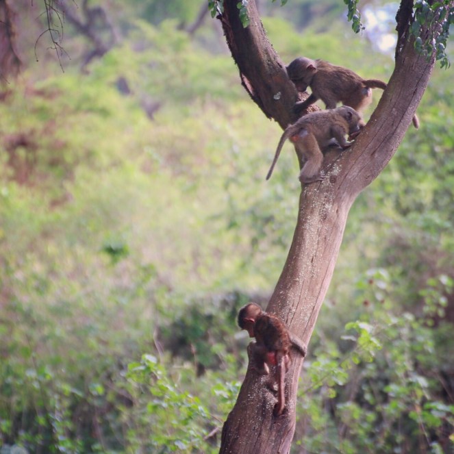 De första djur vi såg var babianer. Här några ungar i ett träd.