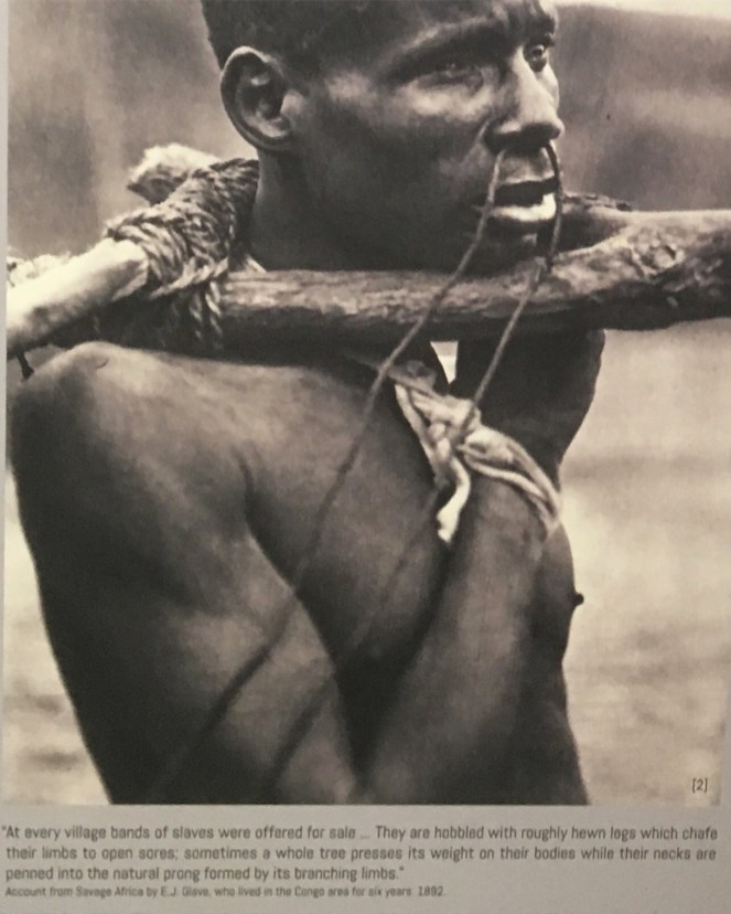 Utställningen består av gammaldags skärmar med tryckt text och bild på som berättar om slaveriets historia. De första skärmarna berättar om varifrån slavarna kom. Det var en bra bit av östra Afrika som var upptagningsområde för slavhandeln på Zanzibar. Skärmarna berättar om hur människor rövades bort med våld och hur hela byar förstördes. Ett fotografi föreställer en swahilisk sultan med namnet Rumaliza som under den andra halvan av 1800-talet handlade med både järn och slavar och tillsammans med en Tippu Tip, som inte presenteras närmare, dominerade handeln i hela Tanganyika, det vill säga nuvarande Tanzanias fastland.