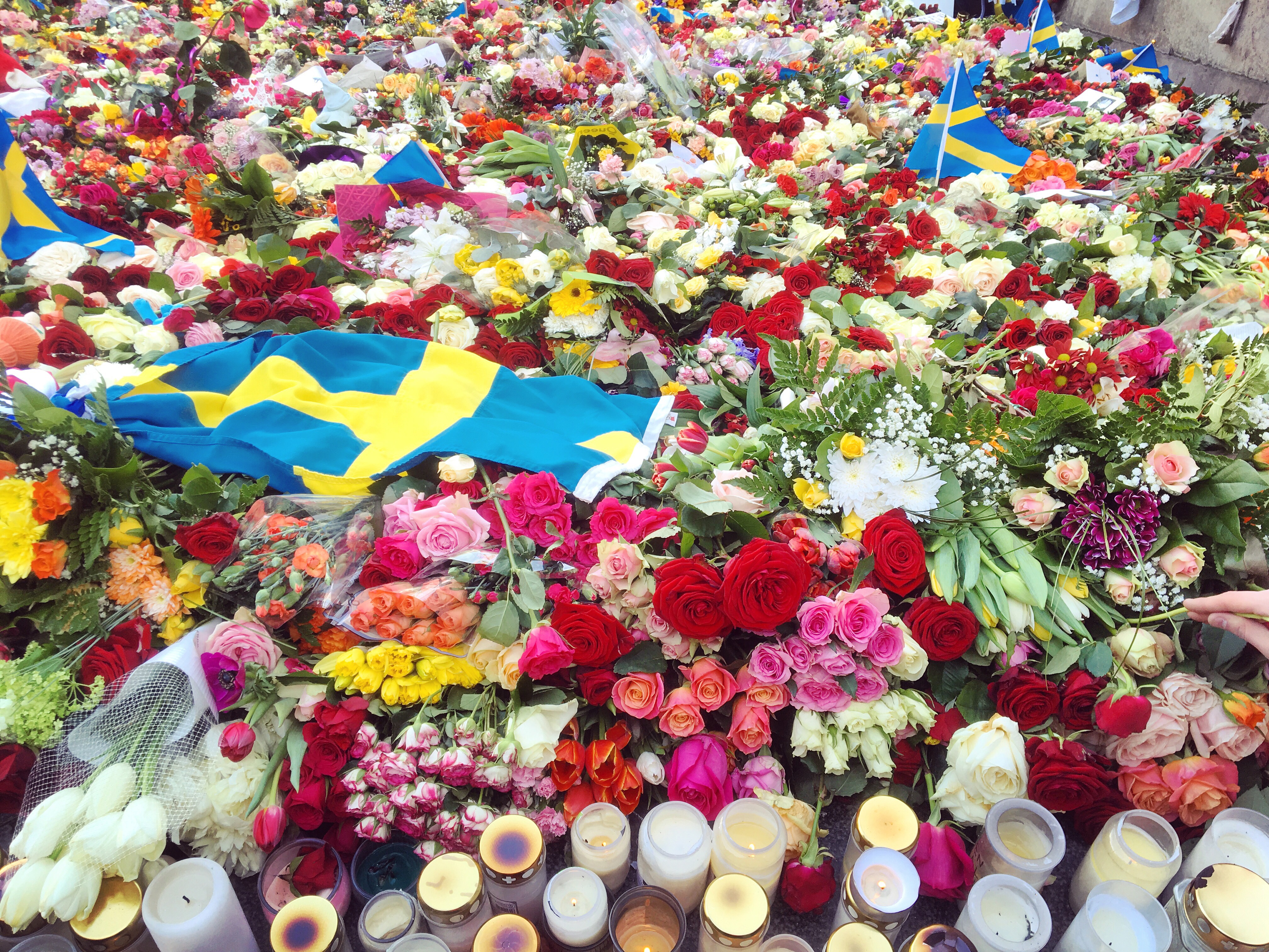 Vi hade ett sedan länge inplanerat stopp på ett par timmar i Stockholm idag. Vi passade på att hedra offren för fredagens attentat med en bukett tulpaner som vi köpte på centralen och som Albin la ner i blomsterhavet på trapporna vid Sergelstorg.