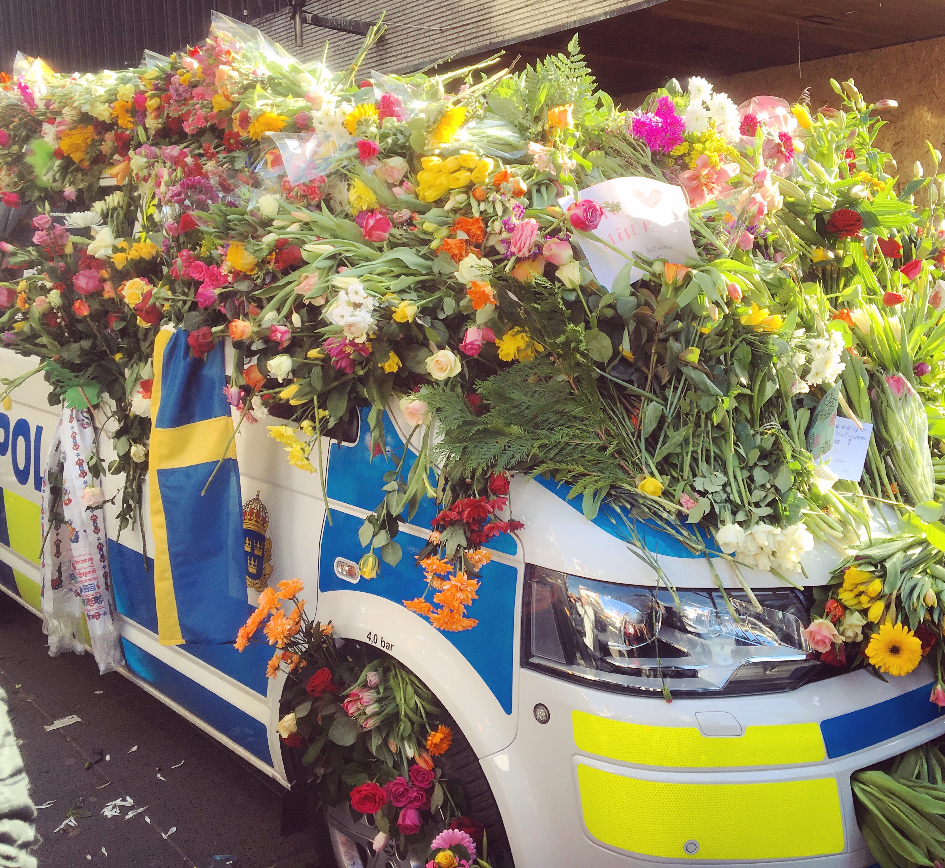 Sedan vi ätit italienskt gick vi också bort till platsen för fredagens terrorattentat. Blommor på polisbilar och betonglejon.
