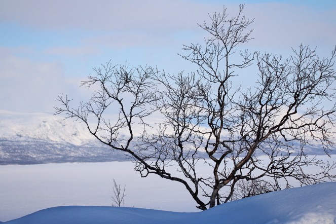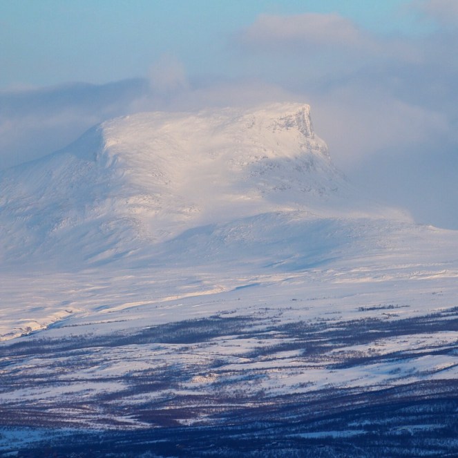 Trots att den är ovanligt insvept i dis och dimma i år har jag flera gånger gett mig ut för att fotografera den. Förgäves. Den här gången har vi inte fått någon av stugorna med utsikt, så det räcker inte med att gå ut på balkongen. Och jag kan alltså inte heller veta riktigt hur vyn ser ut när jag går ut. Det närmaste jag har kommit den här gången är en bild av en bergstopp som utgör den ena av dörrkarmarna i dörren, porten, som heter Lapporten.