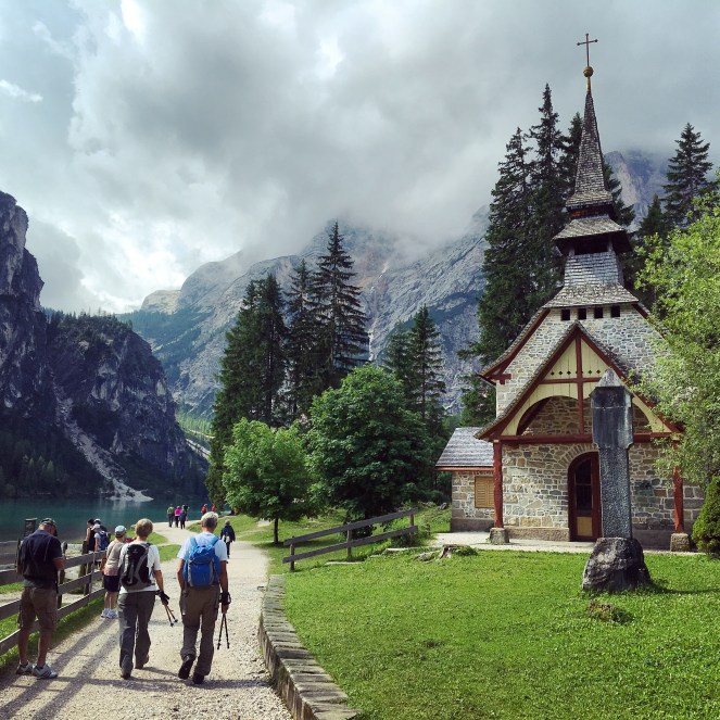 Från hotellet följde vi alltså stigen nere vid sjön åt höger och kom direkt förbi ett litet kapell. Det heter Chiesetta sul Lago di Braies. Det invigdes 1904 och ägs av hotellet. Strax efteråt passerade vi en grind med text på både tyska och italienska som berättar att vi ska stänga grinden efter oss. Sjön ligger i Sydtyrolen som är den nordligaste av de italienska provinserna. Av den halva miljon människor som bor i området är hela 70 procent tyskspråkiga. Direkt efter grinden finns bänkar och bord för den som har med sig fika på vandringen. Vi valde att äta på hotellet men min familj väntade in mig på en av bänkarna sedan jag redan stannat flera gånger för att fotografera.