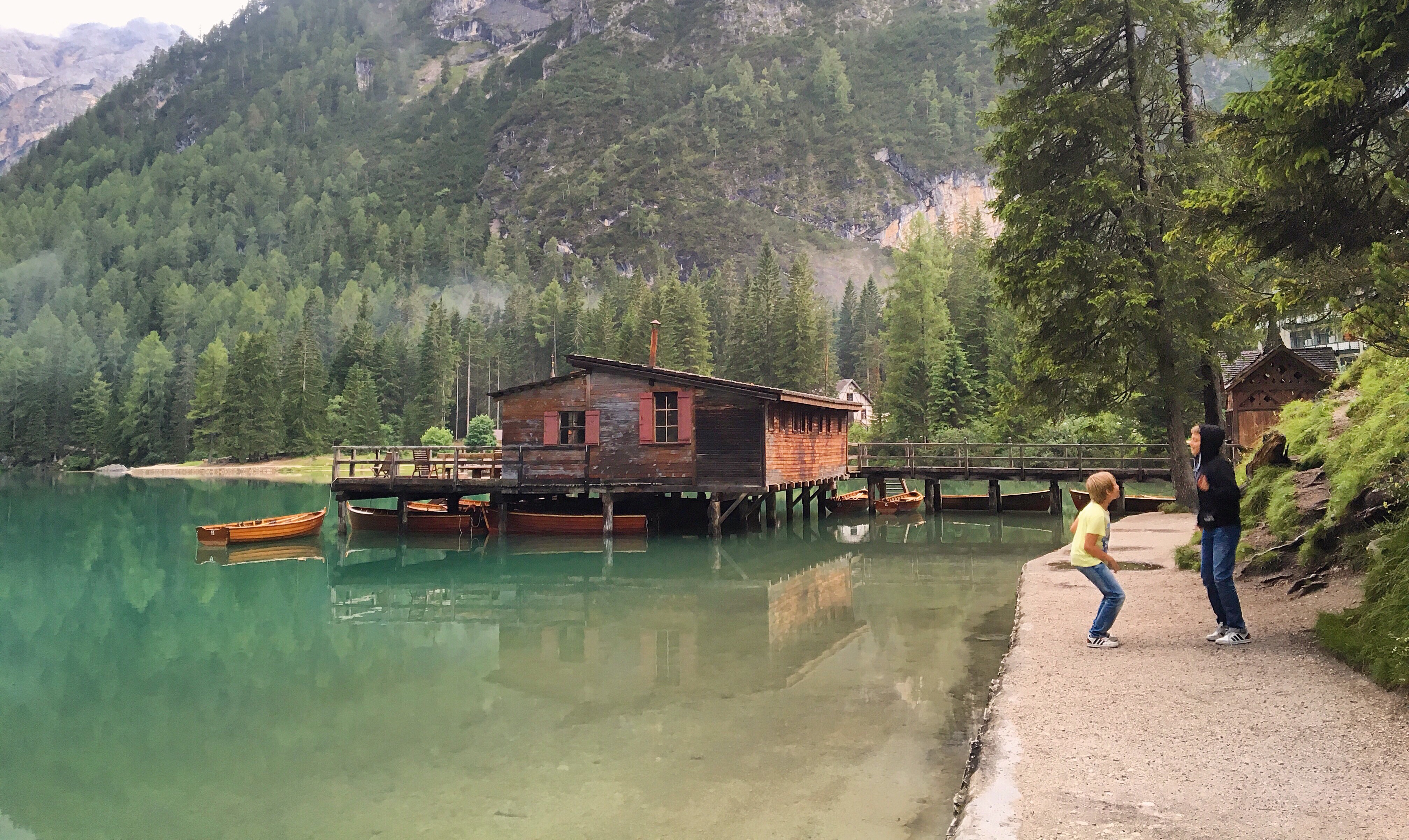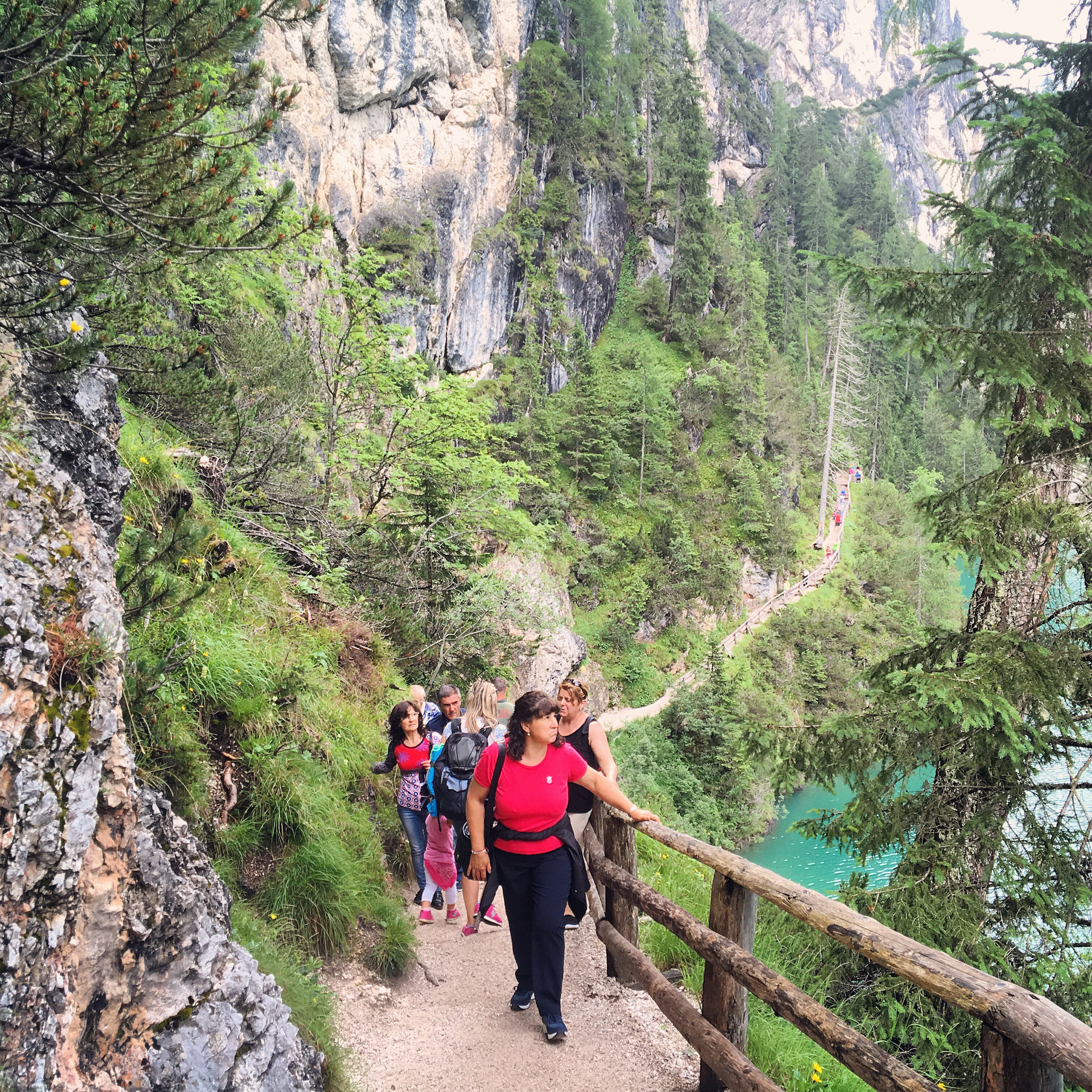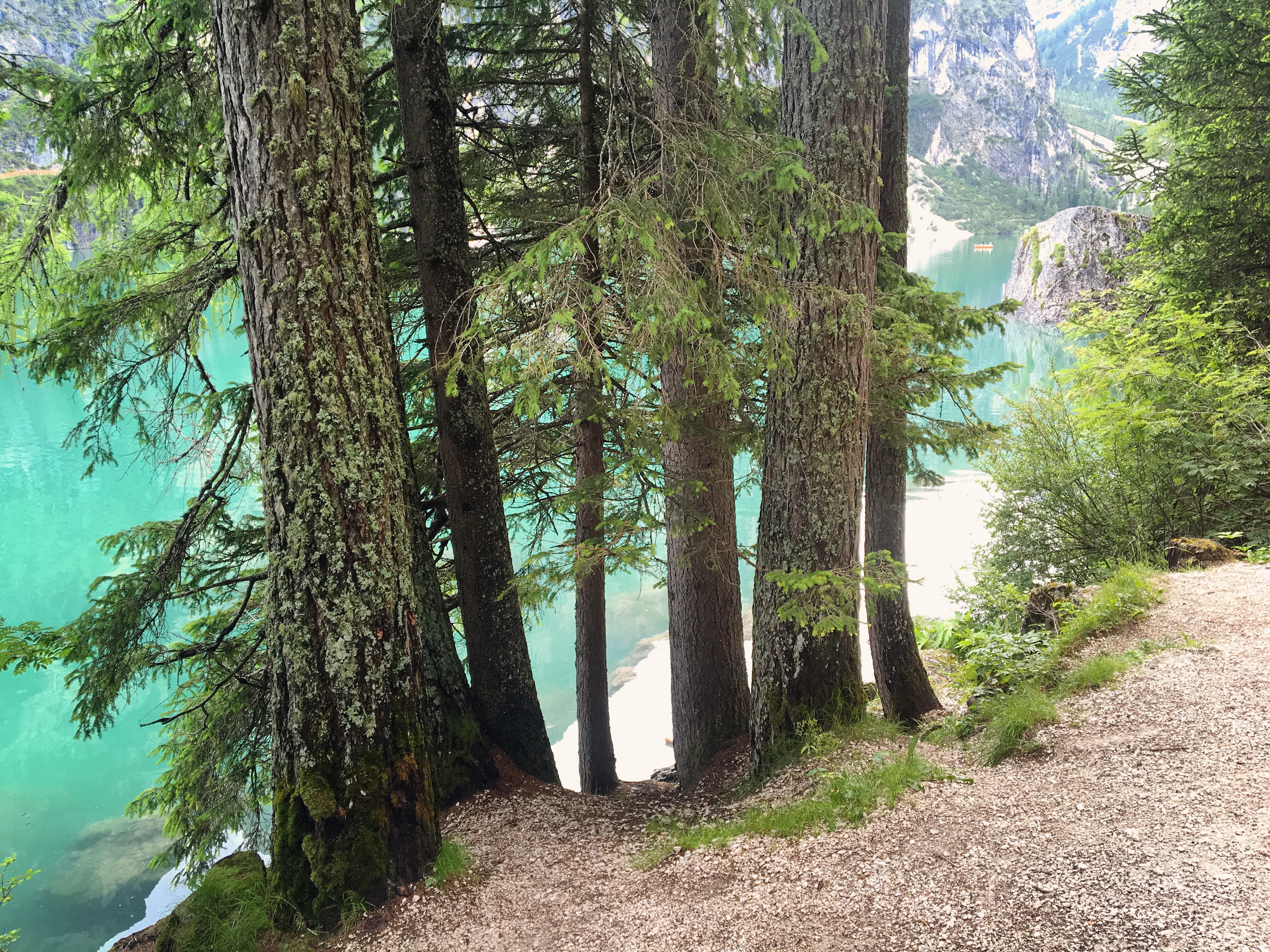 Från hotellet följde vi alltså stigen nere vid sjön åt höger och kom direkt förbi ett litet kapell. Det heter Chiesetta sul Lago di Braies. Det invigdes 1904 och ägs av hotellet. Strax efteråt passerade vi en grind med text på både tyska och italienska som berättar att vi ska stänga grinden efter oss. Sjön ligger i Sydtyrolen som är den nordligaste av de italienska provinserna. Av den halva miljon människor som bor i området är hela 70 procent tyskspråkiga. Direkt efter grinden finns bänkar och bord för den som har med sig fika på vandringen. Vi valde att äta på hotellet men min familj väntade in mig på en av bänkarna sedan jag redan stannat flera gånger för att fotografera.