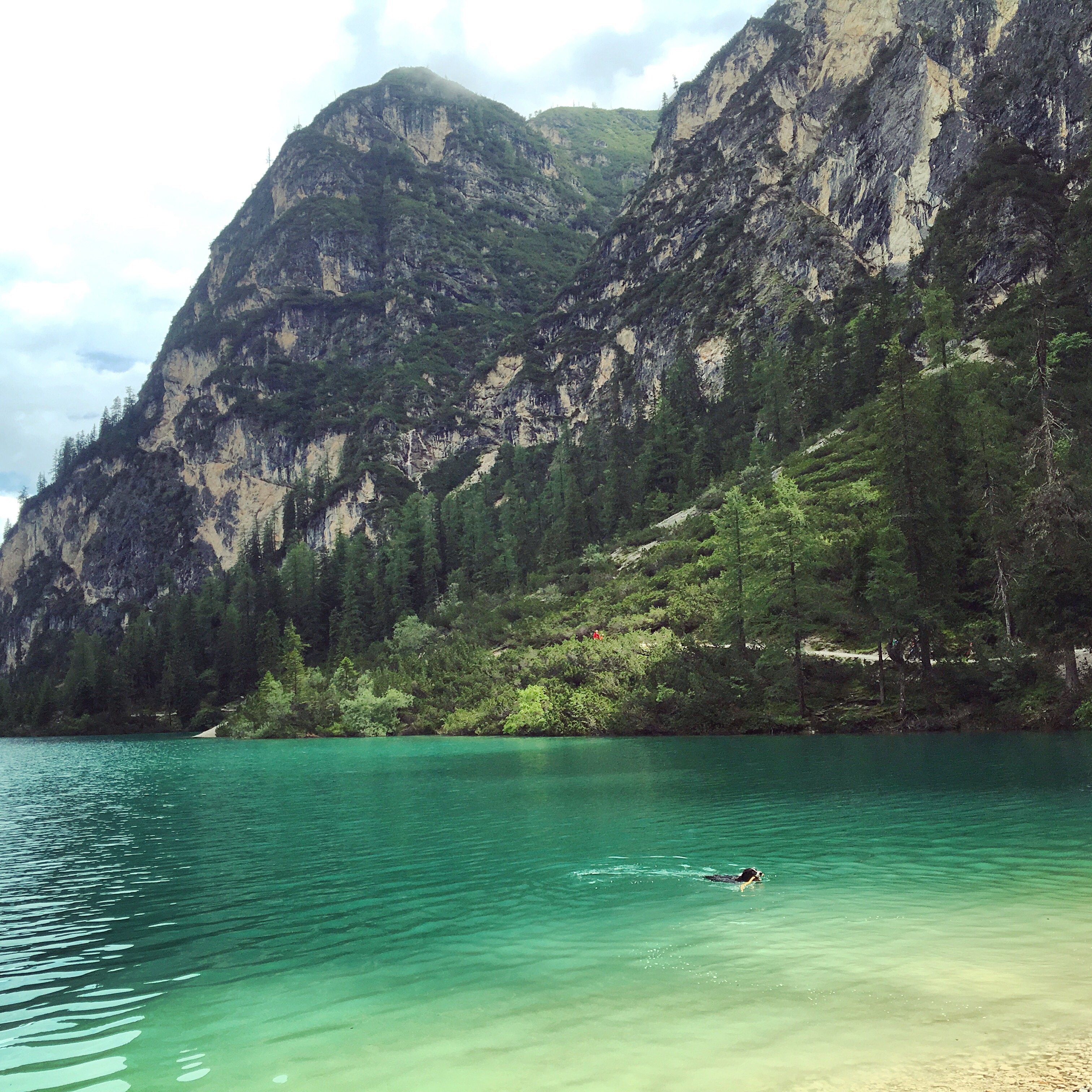 Stigen längs den västra sidan av sjön är lättvandrad, nästan som en grusad väg och du tar dig snabbt till den södra änden av den lilla alpsjön som ligger 1500 meter över havet. Vid den södra änden finns några små och grusiga men vita stränder. Det är nog ovanligt att det är så varmt här att du känner för att bada. Men kanske doppa tårna i vattnet en hyggligt varm sommardag? När vi var här såg vi bara en hund bada. I den här änden av sjön hörs och skymtas också ett vattenfall på avstånd, en bit upp på berget.