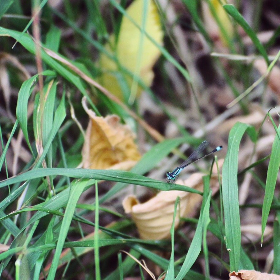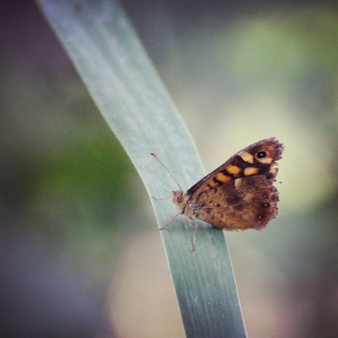 Stigen går som en tunnel genom vegetationen och det känns lite som att gå i en djungel med lövträd och fjärilar. Inte alls som vid Medelhavet. Säkert bidrar det varma och fuktiga vädret också till den känslan. Fjärilarna har ett rutigt mönster på vingarna och därtill ett ”öga”. De är rikliga i antal. Möjligen är det kvickgräsfjärilar jag ser. Jag fotograferar också en ljusblå slända.