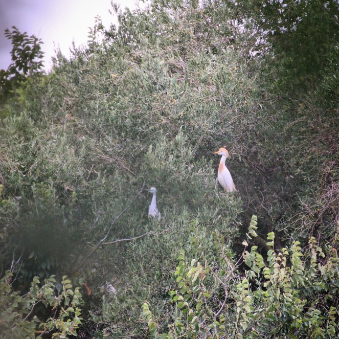 Vi hade tänkt följa den svartamarkerade vandringsleden 1,3 km till ett fågeltorn men vi läser på en skylt att det är avstängt för reparation så vi går bara till den första utsiktsplatsen innan vi vänder. Där ser vi bara ett stort område med riktigt hög vass. Men på vägen dit passerade vi ett par kanaler där vi såg vita hägrar. Minst ett par olika sorter. Bland annat kohäger som är gul på bröstet och har som en liten ”frisyr” på huvudet. Sothöns, rörhöna, purpurhöna och gräsänder såg vi också.