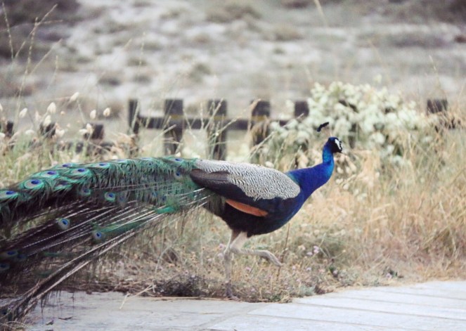 På vägen ner mot havet möter vi den påfågel vi tidigare bara hört skrika i buskarna. När vi kommer ner på stranden har himlen börjat skifta i rosa vid horisonten men ännu syns ingen soloskiva. En bit bort till höger om oss badar ett par personer i vattnet. På bryggan till vänster sitter ett annat par intill varandra och väntar in det kommande skådespelet. Två män med varsin kamera vakar för sin del in det ögonblick när den livgivande himlakroppen ska visa sig, ståendes precis intill bryggan.