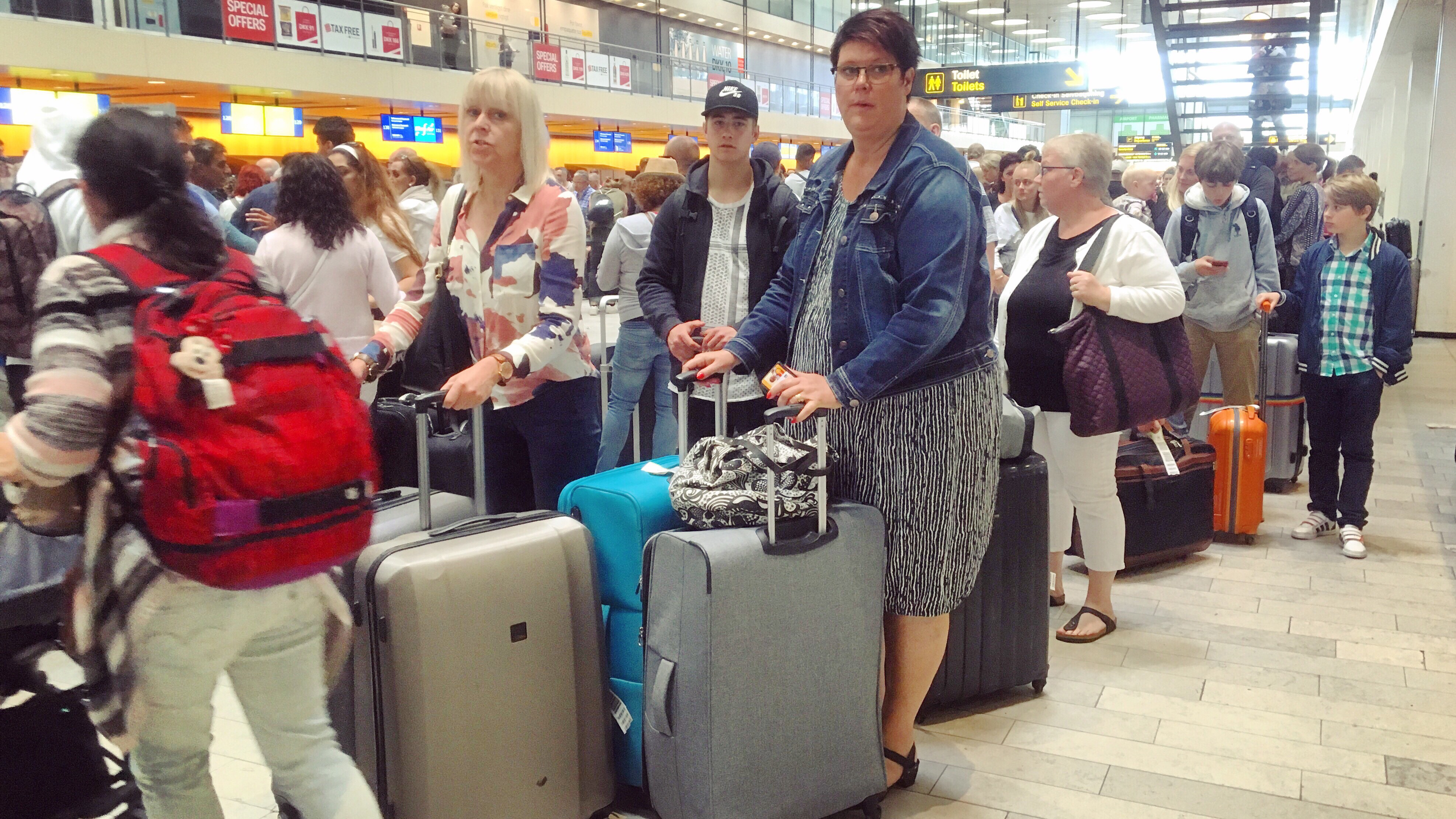 Ni går till bagageinlämningen. Så klart att det flygbolag som du valt att resa med – Thomas Cook den här gången – har Kastrups längsta kö! När ni äntligen kommer fram i kön strular självskanningen av väskorna så pass att en tidsgräns passeras. Och ni hänvisas till den bemannade disken. Och när väskorna väl är inlämnade och ni ska gå upp till säkerhetskontrollen motas ni bort av flygplatsens personal som säger att de har översvämning i säkerhetskontrollen i Terminal 2 så ni får gå tillbaka till Terminal 3 och gå igenom där istället. Men först ska ni stå i kö igen…