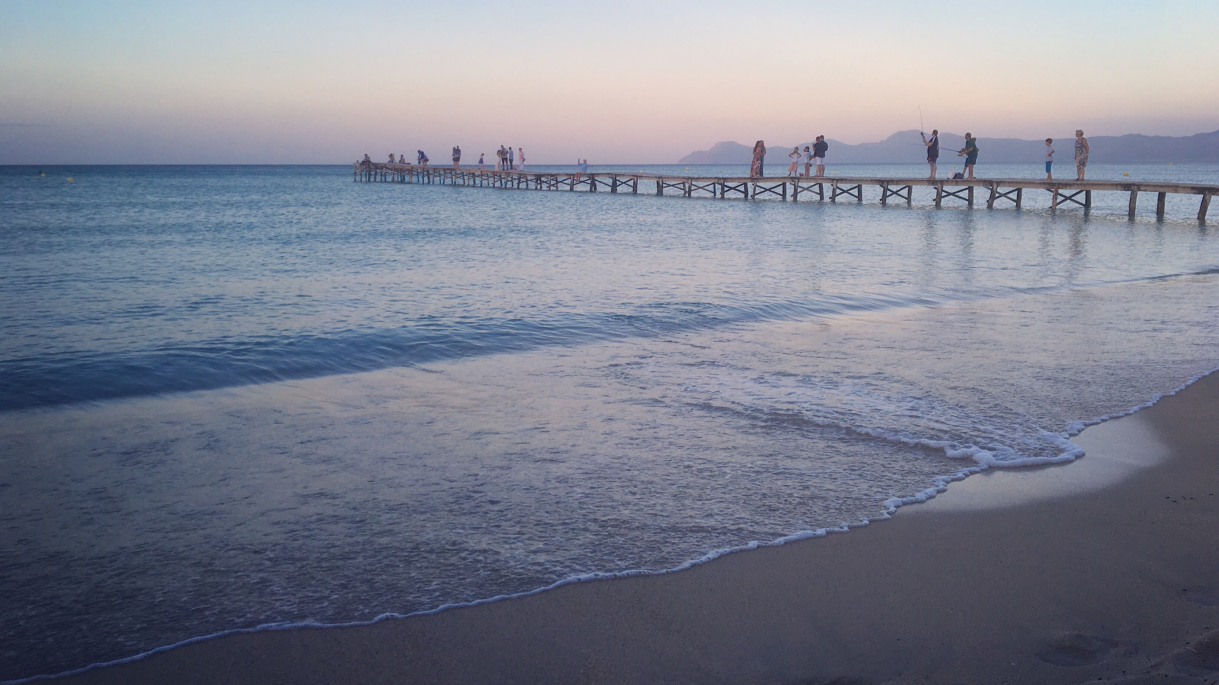 Efter att ha frågat de andra i familjen om de sett korten och fått nekande svar klarnar bilden över hur jag blivit av med korten ganska omgående. Efter middagen var vi nere på stranden. Jag öppnade plånboksfodralet för att fotografera med mobilen. Bryggan vid Playa de Muro i skymningsljuset full av människor: de som fiskade, de som fotograferade porträttbilder och de som bara njöt av den fina kvällen och de som väntade på någon annan som fiskade, fotograferade eller njöt av kvällen.