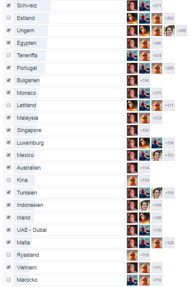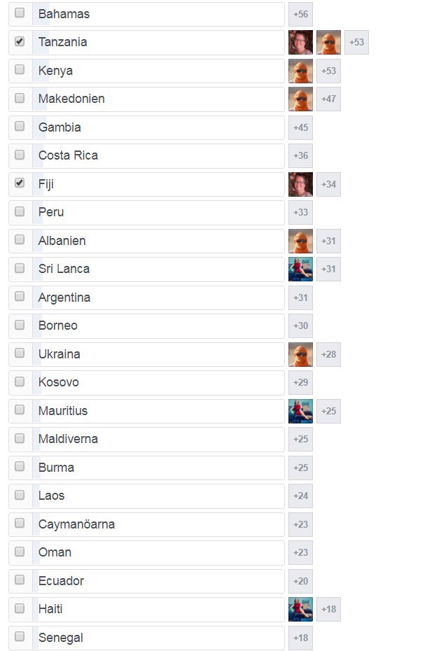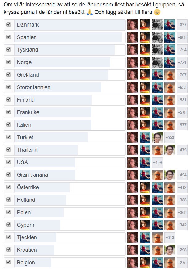 Just nu pågår en omröstning eller snarare enkät i en grupp på Facebook som jag är medlem i om vilka länder som gruppmedlemmarna besökt. Även om enkäten inte är avslutad än tycker jag att det redan nu är en intressant lista. Jag väljer därför att publicera den här som den ser ut just nu. Både som skärmdumpar men också som en lista där talet efter plustecken vid varje lands namn är det antal personer som svarat att de varit i landet.