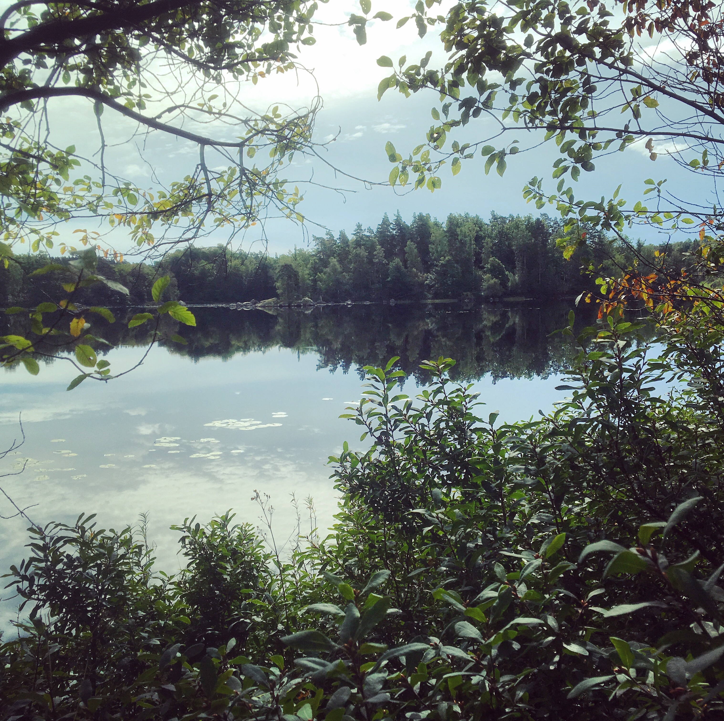 Första skogsvägen vi tog in på resulterade i att vi hittade en fin, spegelblank insjö. Men ingen svamp. Vi hittade inte ens något bra ställe att parkera bilen.