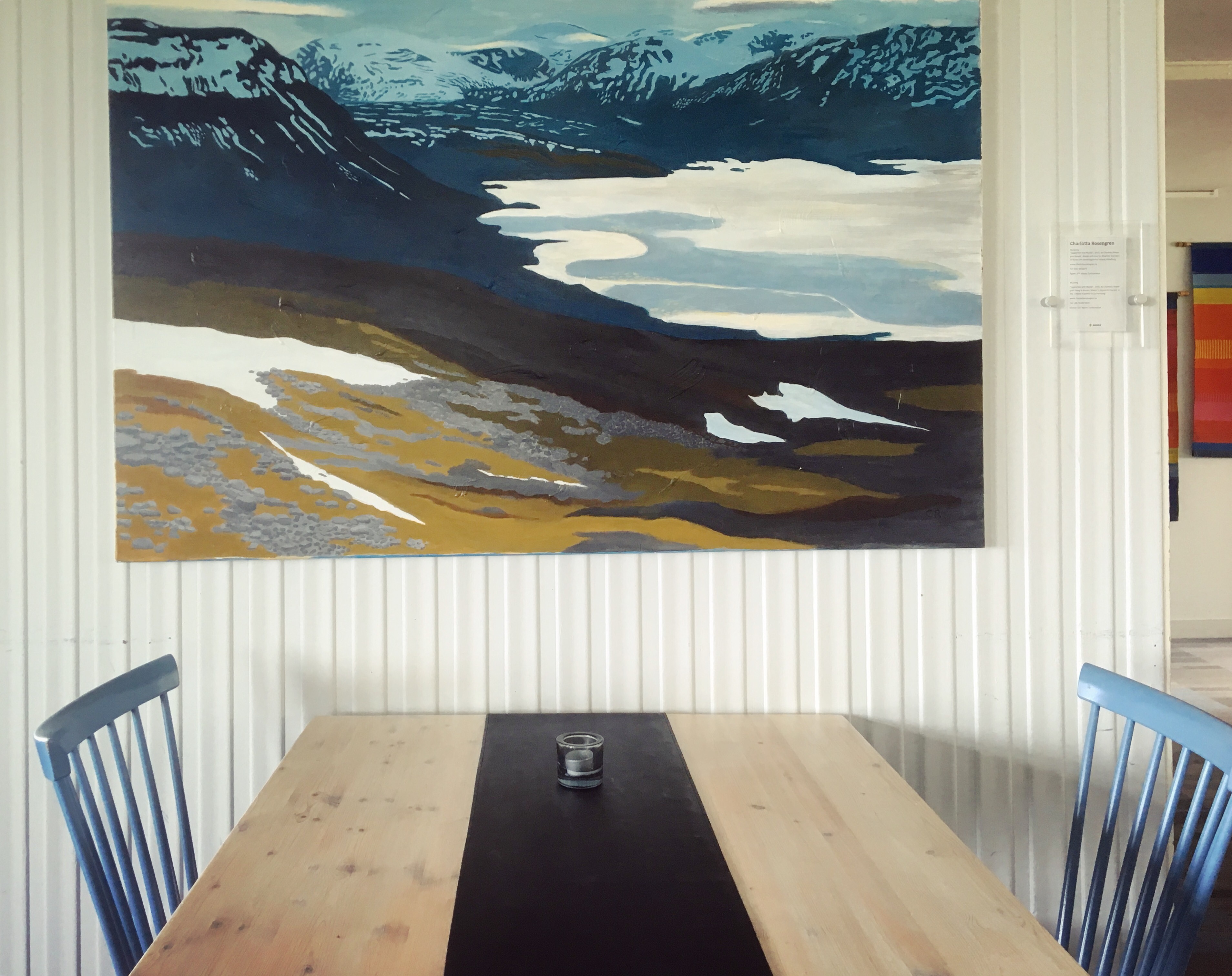 Vi befinner oss på restaurang Kungsleden i STF:s fjällstation i Abisko. Träbord, blåa pinnstolar och tavlor med fjällmotiv. Men den vackraste tavlan är ändå fönstren med vyn över den plats där Abiskojokk rinner ut i den blåa sjö som är fjällvärldens största och Sveriges sjunde i storlek och andra i djup. Torne träsk. När måltiden är över börjar solnedgången skymta bakom fjället Slåttatjåkka och det är också en minst sagt vacker syn.