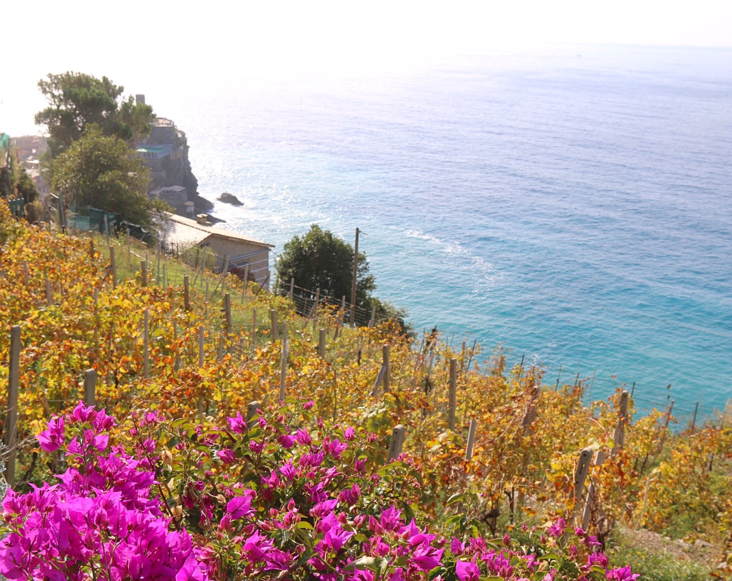 Översta bilden: utsikt mot Monterosso al Mare. Nedan utsikt över vinodling i höstfärger och utsikt mot Vernazza.