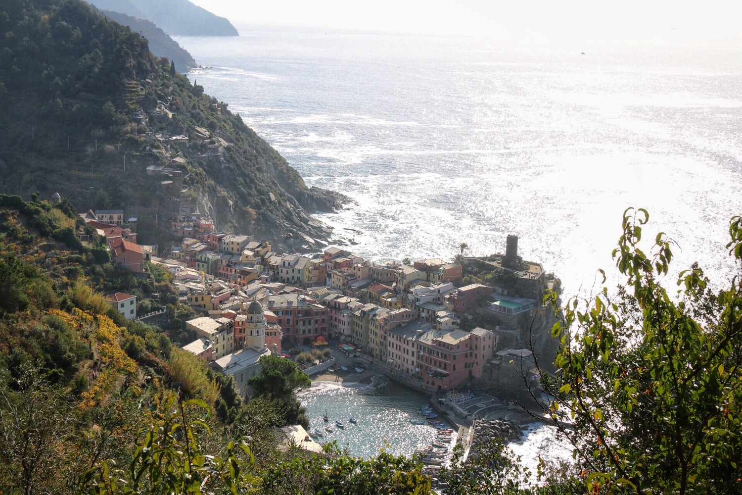 Vandringen utgår gärna ifrån det lilla torget vid hamnen i Vernazza. Nära torgets östra hörn leder en trappa upp för en gränd mot norr. Där är skyltat mot ”Monterosso”. En bit upp tar du till vänster och följer sedan stigen som är markerad med röd-vita målade sträck hela vägen till Monterosso al Mare. Vi började gå tidigt på förmiddagen så vi kunde blicka ner mot ett Vernazza i motljus. Vi passerade igenom några vinodlingar och genom skog. Ofta hade vi fina vyer ut mot havet och byarna.