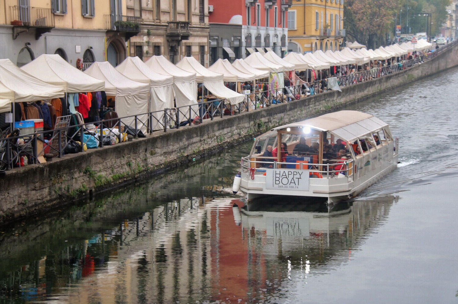 Det är en disig eftermiddag och miljön runt kanalen är mysig med många kaféer och restauranger, gatuförsäljare och en mer välordnad gatumarknad. Cyklar står parkerade, ett par svanar simmar i kanalen, och en and av något slag som jag inte vet närmare vad det är för sort. Kärlekspar vandrar hand i hand, andra sitter på en bänk, en turistbåt skär igenom det stilla vattnet. Det är verkligen ett mysigt område att vandra i, men räkna inte med att vara de enda turisterna som hittar hit. Tvärt om. Området ökar i popularitet. Hade vi haft fler dagar i Milano hade jag gärna utforskat kanal-systemet ytterligare, kanske med båt, och kanske då hittat bortanför turiststråken, men nu fick det räcka med en snabbtitt.