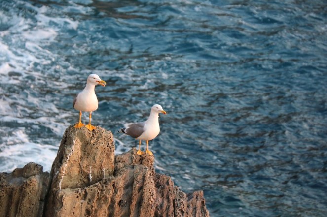 Husen på klipporna ovanför hamnen klamrar sig fast på ett alldeles orimligt sätt som trotsade de tyngdlagen fullständigt. Men vem bryr sig om Newtons lagar när en stor strålande apelsin sänker sig i Medelhavet och färgar himlen rosa? Det är måndag kväll på höstlovet, för precis en vecka sedan, och vi besöker Riomaggiore i solnedgången.