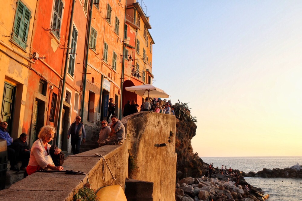 Husen på klipporna ovanför hamnen klamrar sig fast på ett alldeles orimligt sätt som trotsade de tyngdlagen fullständigt. Men vem bryr sig om Newtons lagar när en stor strålande apelsin sänker sig i Medelhavet och färgar himlen rosa? Det är måndag kväll på höstlovet, för precis en vecka sedan, och vi besöker Riomaggiore i solnedgången.