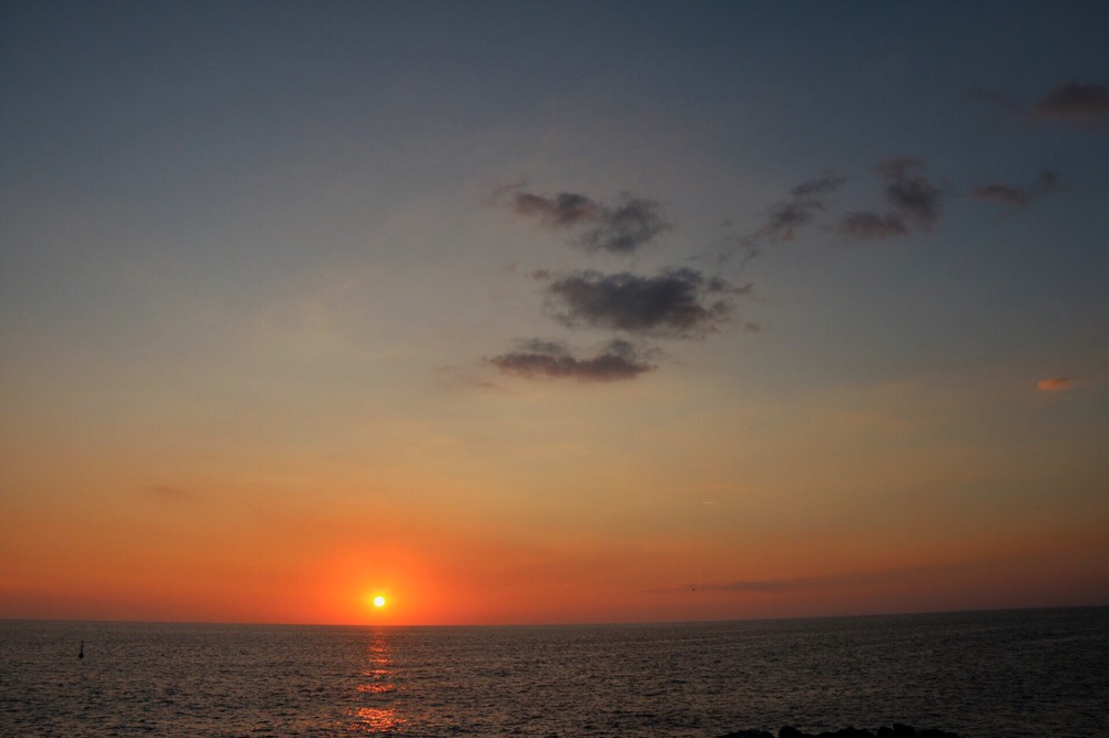 Vi följer strömmen ner mot hamnen. Jag stannar och fotograferar. Plötsligt är de andra borta. Det är gott om andra turister nere vid vattnet. Och solnedgången är redan vacker. Ganska snart får jag ett SMS från ”General Squirrel”. Det är min förstfödde som lyckats döpa om sig till det i min mobil, jag har aldrig riktigt begripit hur han gjorde, men kanske är det för att jag och pojkarna har gemensam Apple-Id? ”Var är du?” undrar han. ”Vid havet. Och ni?” svarar jag och sedan dyker de upp alldeles intill mig. De har köpt glass visar det sig. Jag vill också ha en. Jag köper min på vägen tillbaka. Men först ser vi solen gå ner bakom horisonten.