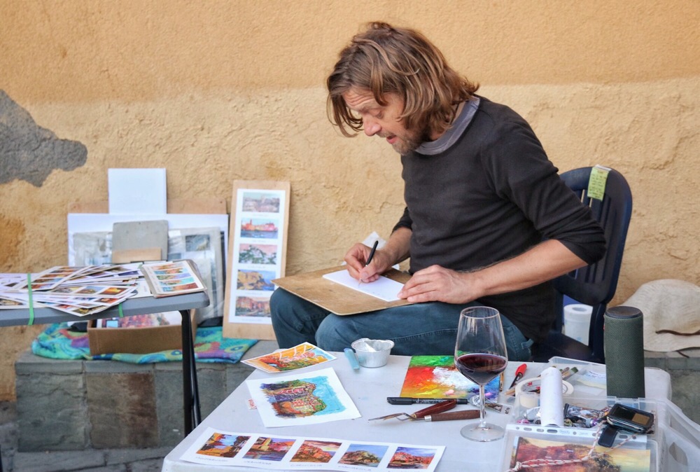 När solen passerat horisontallinjen har färgskalan övergått från turkost marinblått och orange till stålgrått och rosa. Drönaren är borta men landskapet är fortfarande mycket vackert. En konstnär sitter på en plaststol och skissar små bilder med hus och landskap. Andra, färdiga bilder, har han liggande till försäljning på ett campingbord framför sig. På bordet står också ett glas med rött vin. Han sitter på rätt plats i världen. Det här är verkligen en miljö som gör sig på bild. Men det verkliga konststycket och konstverket måste nog ändå vara byn i sig själv. Hur har byggarna som ställt husen på plats burit sig åt?