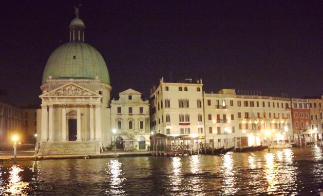 Bilden: San Simeone Piccolo som den ser ut när vi passerar förbi på andra sidan Canal Grande i ett nästan folktomt Venedig en februarinatt. Och hittar till hotellet gör vi lätt som en plätt!