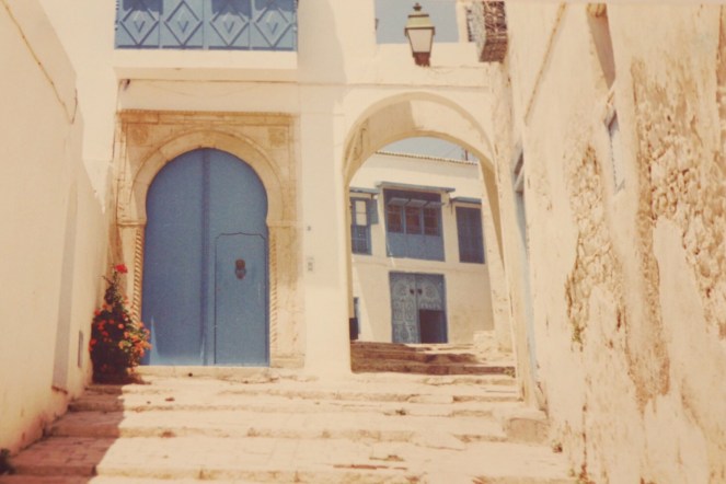 Sidi Bou Said – en tunisisk sevädhet tack vare de vackra vita husen med blå dörrar, fönster och andra detaljer. Vi var där 1989. Därav de lätt gulnade fotografierna.