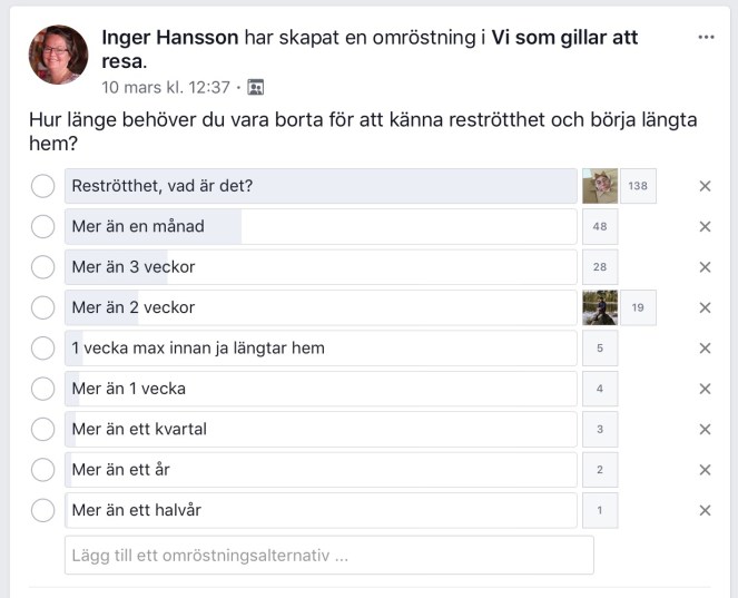 Jag fick flera intressanta kommentarer också, som Frida Thelén som skrev ”Beror lite på vad för slags resa. Bara en enkel charterresa där man bara solar och badar kan jag börja längta hem efter typ 10 dagar. Men åker man i väg på en lite häftigare resa så kan det nog dröja veckor i alla fall. ;)”