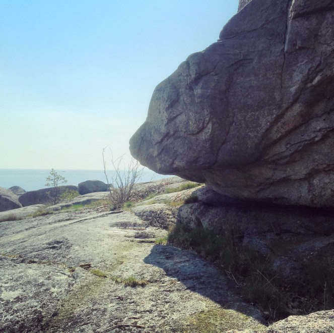 Vid Altare hall, ett stort flyttblock vänder vi in mot halvöns mitt och det gamla vattenfyllda stenbrottet vid Stolta slätt. Men först stannar jag för att fotografera stenblocket ur olika vinklar. I den första vinkeln tycker jag att stenen har formen av ett björnhuvud.
