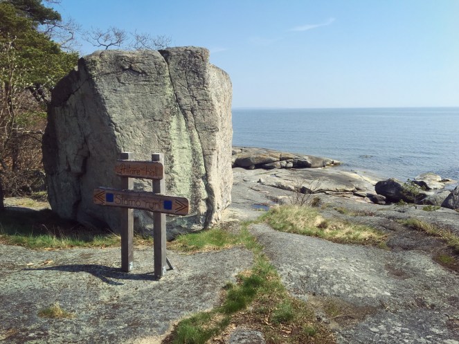 När vi sätter oss ner på varsin sten ute vid havet på Sternös av inlandsisen mjukt rundade klippor har vi promenerat via Hinsetunneln, vidare på gång- och cykelvägen ut mot Södra Stärnövägen, över Oljehamnsvägen och vidare ut längs Södra Stärnövägen fram till den delar sig vid Boövägen. Där såg vi en rådjursbock röra sig inne i skogen innan vi vandrade vidare mot Stärnö Vindhamn. Men strax innan småbåtshamnen tog höger in på en skogsväg som vid en p-plats övergår i en stig ner mot havet.