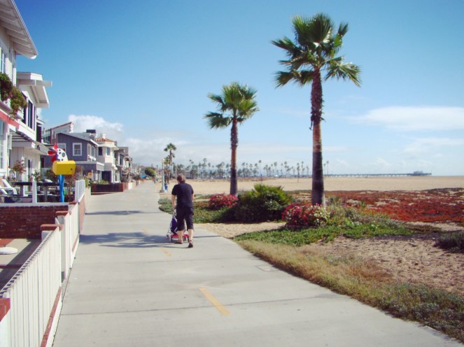 Oceanfront Boardwalk börjar i västra Newport Beach i slutet av 36th Street och går nästan fem kilometer söderut på halvön Balboa. Längs strandpromenaden, en gång- och cykelväg, ligger strandvillor med utsikt över havet och sanden. Många är nog exklusiva sommarvillor. Jag minns när vi gick där och först passerade ett hus med den lilla trädgården inredd i hippiestil och nästa i strikt militärt marin stil, att jag tänkte att här har många olika rika människor investerat sina pengar var och en i sin egen dröm om hur livet borde vara. Och nu står alla dessa materialiserade drömmar på rad längs havet. Och när vi var här, i lågsäsong, dessutom för tillfället mestadels övergivna.