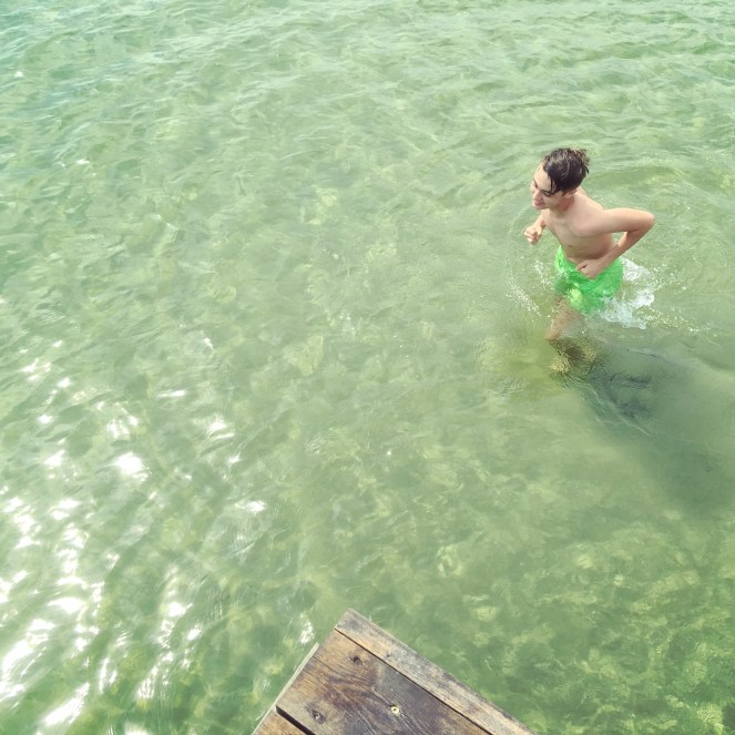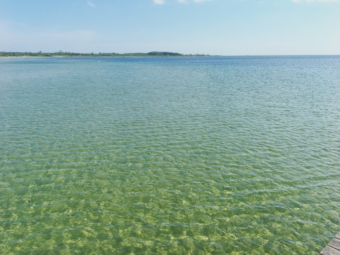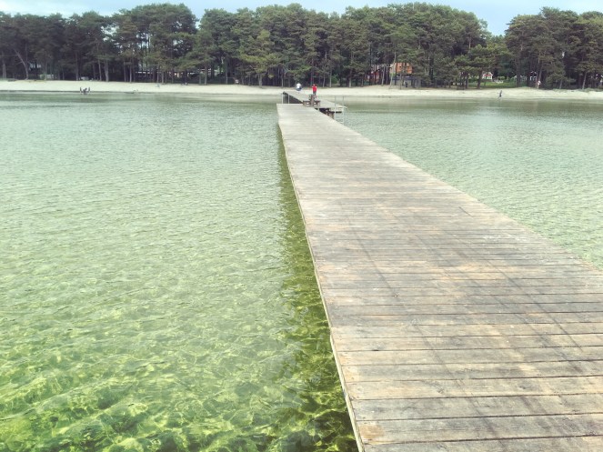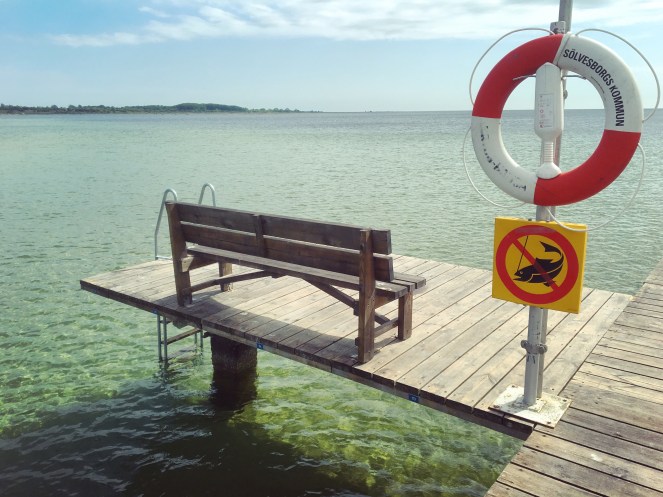 Stranden är fin men var full av tång idag. Vi gick ut på bryggan och satte oss på en bänk. Trots att det då var mulet hoppade pojkarna i vattnet. Efterhand klarnade det upp och solen tittade fram. Vinden friskade i där ute på bryggan men det var lugnare inne vid land.