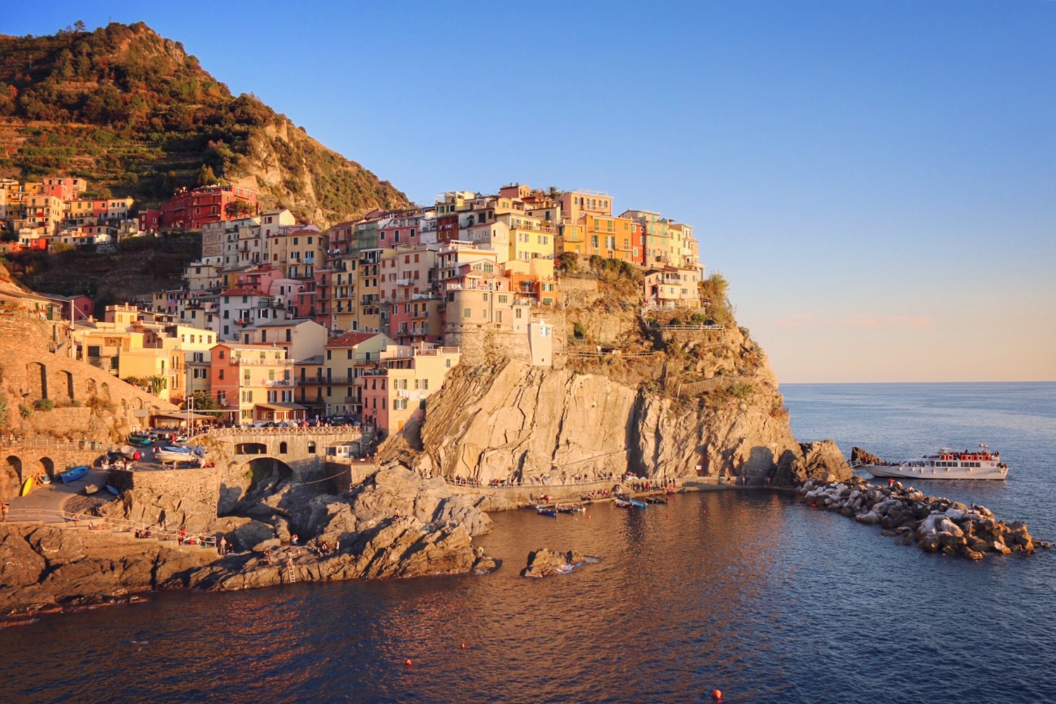 Husen på klipporna ovanför hamnen klamrar sig fast på ett alldeles orimligt sätt som trotsade de tyngdlagen fullständigt. Men vem bryr sig om Newtons lagar när en stor strålande apelsin sänker sig i Medelhavet och färgar himlen rosa? Riomaggiore är den sydligaste av byarna som räknas till Cinque Terre, i norra Italien och den är alldeles fantastiskt vacker. Inte minst i solnedgången.