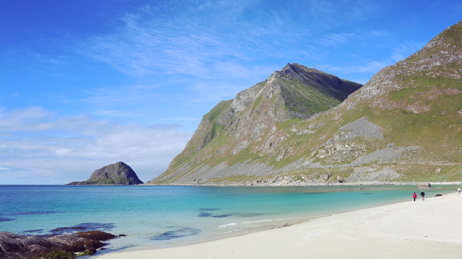 Hauklandstranda, som den heter på norska, ligger på Lofoten i Nordnorge och är delad i två. Längs den första delen står långliggande husvagnar uppställda på privata, inhägnade gräsplättar. Här finns utöver det inga bra parkeringsmöjligheter. Men kör vidare en kort bit på vägen som går mot Uttakleiv och precis innan tunneln kommer du till den lilla byn Haukland och den andra delen av stranden. Här är jättevackert! Vit sand, turkost vatten och höga berg. Lite kallt i vattnet bara…