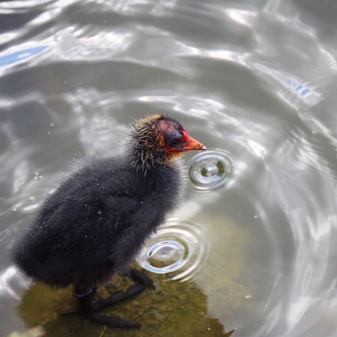 I en av dammarna simmar sothöns. Jag stannar till för att fotografera de söta ungarna med sina röda punkfrisyrer.