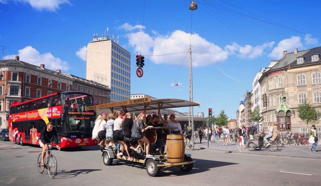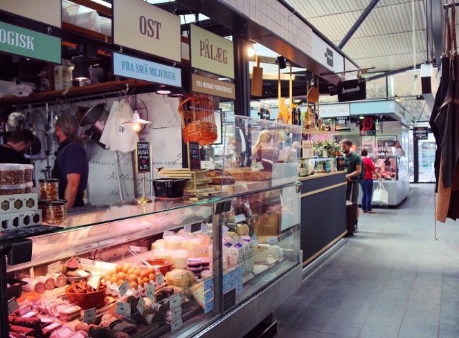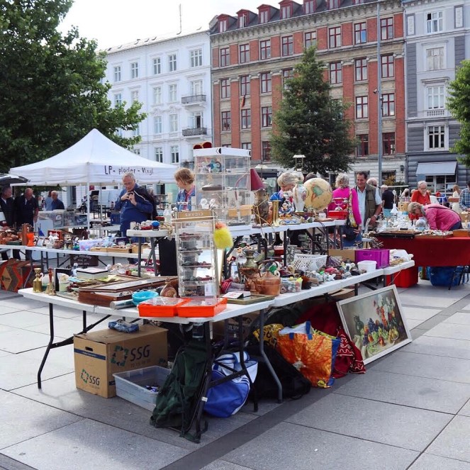 På Israels Plads passerar vi en loppmarknad innan vi fortsätter in i saluhallarna (Torvehallerne). Här har vi inte heller varit förut. Jag föreslår att vi ska äta här men tolvåringen gillar inte att här är mycket folk så vi fortsätter vidare. Ett gäng kvinnor skrålar till en gammal hit av Spice Girls när de passerar på en cykelbar.