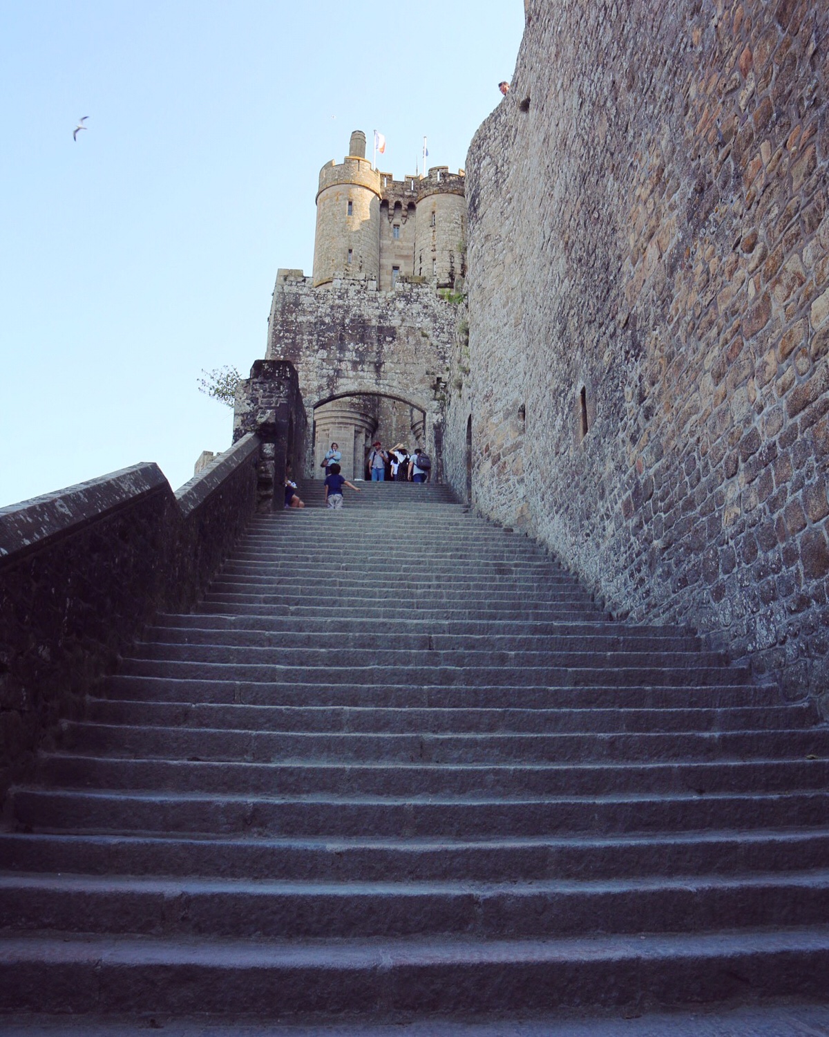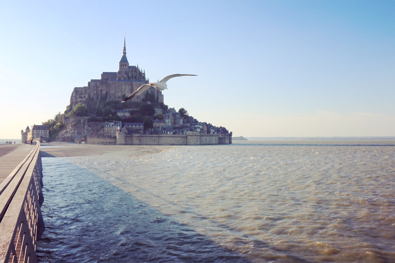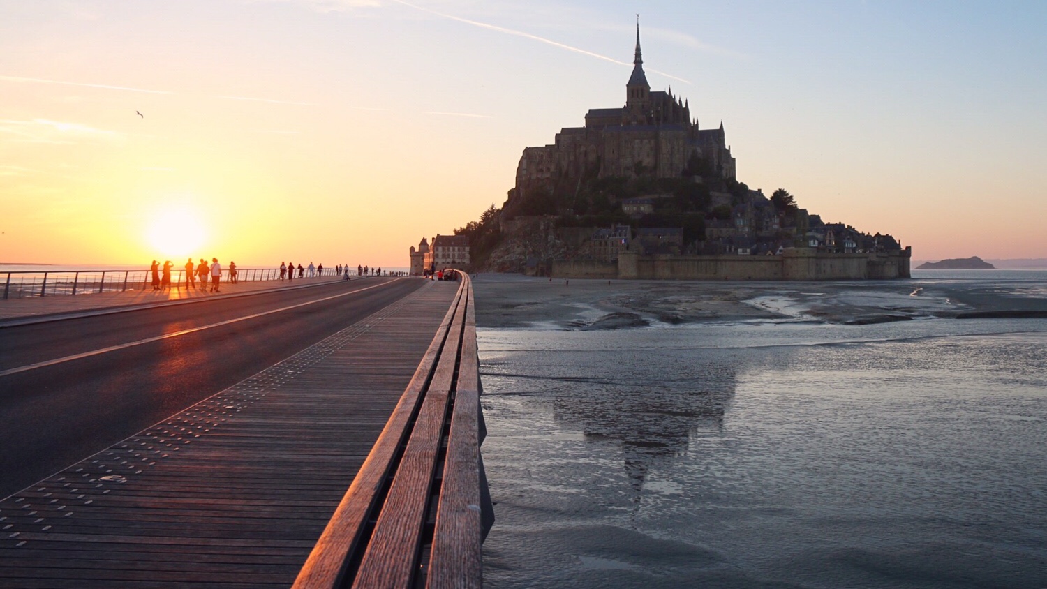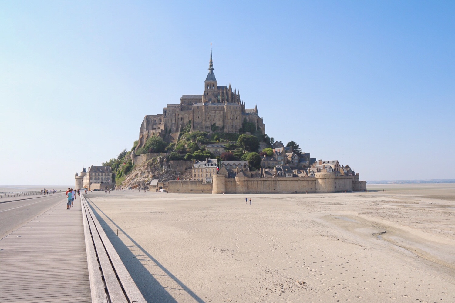 Vi står uppe på berget på den berömda ön i Normandie och blickar först upp mot klostret och den den gyllene ärkeängeln Mikael högst uppe på tornets topp innan vi vänder blicken nedåt mot bron som leder tillbaka mot fastlandet.