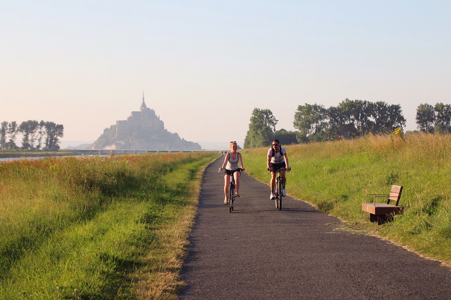 Vad vi upptäckte väl på plats är att många cyklar till ön. Exakt var de parkerar cyklarna när de väl är framme vid ön noterade jag aldrig, men längs floden Couesnon går en asfalterad gång- och cykelväg som är perfekt inte minst för cyklister, eftersom avstånden här är ganska stora.
