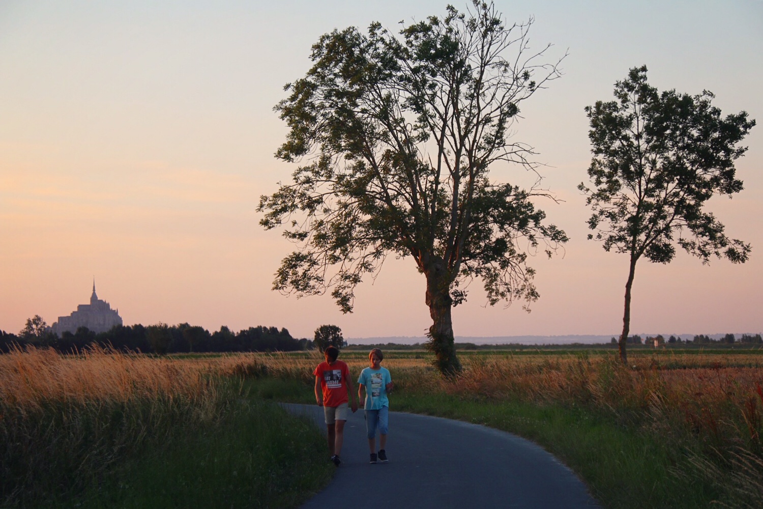 Du behöver inte komma långt bort från ön om du vill slippa ifrån turisthorderna. Den här kvällen, vår andra, valde vi att gå den närmaste väg som Google Maps visade från vårt hotell i byn Beauvoir till klosterön. Vi gick längs en smal bilväg förbi sädesfält, potatis- och morortsodlingar och var alldeles ensamma i landskapet. Bara en bil mötte vi. Kvällen innan, däremot gick vi först in till en restaurang i byn som jag kan rekommendera, La Fermette (Anders åt bland annat fantastiskt goda ostron som även jag smakade – och gillade – som annar inte äter ostron), innan vi följde cykelvägen ner mot havet. Det var mycket vackert med juninattens alla blommor, fjärilar och fågelkvitter. Då gick vi senare på kvällen, i solnedgångstid, och även om vi inte var helt ensamma var det verkligen ingen trängsel. Om jag hade haft fler dagar till mitt förfogande skulle jag lagt till vandringar i våtmarkerna längs kusten, och även passat på att se Mont-Saint-Michel från andra sidan viken, men de sträckor vi gick räkte bra och bilder på klostret har jag mer än nog, trots att jag raderat massor av bilder på grund av för många snarlika motiv.