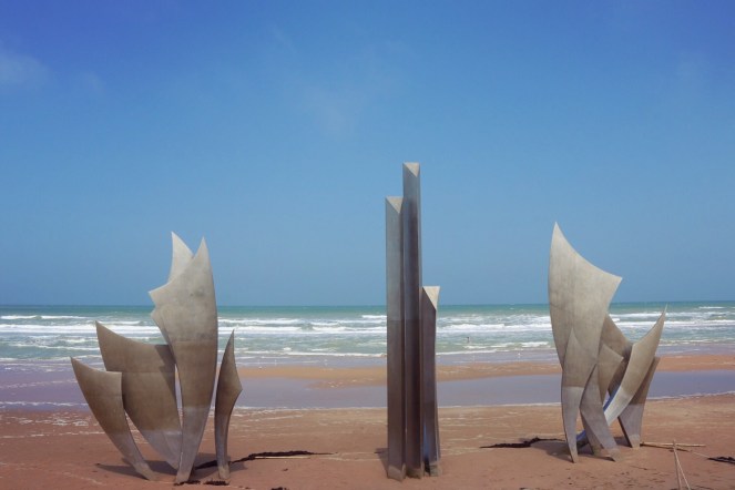 Här hoppar vi över museet på platsen och nöjer oss med att titta på statyerna och stranden. Och äta lunch. Vi sitter utomhus. Jag dricker en Coca Cola till min hamburgare. Nåt tack ska väl amerikanerna ha en sån här dag, tänker jag, för att de befriade Frankrike den där gången. Här är det inte alls lika kallt. Men badkläderna använder vi inte här heller.