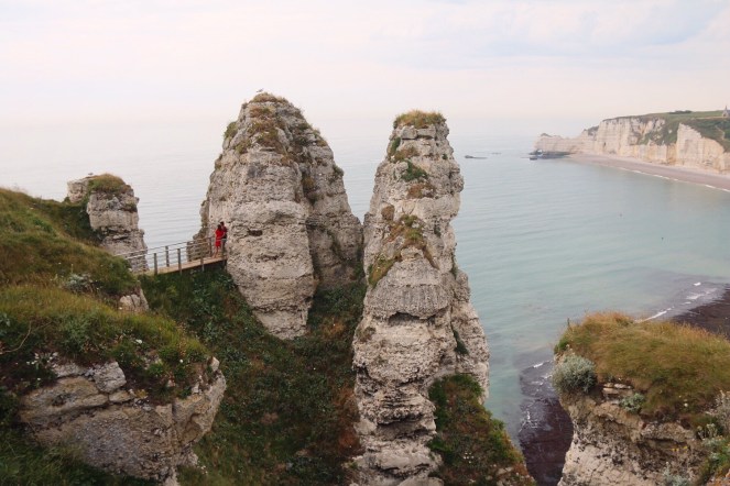 Väl i Étretat är vägen ner mot stranden, som Google visar att vi ska köra, avstängd. Vi parkerar bilen på en p-plats i en backe en bit ovanför byn. Vi söker ut närmaste gångväg mot elefantklippan och följer den. Vi ser en klippa på håll som påminner något om den berömda. Men jag som sett bilder ser att det inte är den. Vi går vidare. Kommer till en vägbom. Skylten på platsen är på franska. Vi förstår att det är privat mark, en golfbana, men är inte helt säkra på om det bara är bilar som förbjudits att passera. Eller om det även gäller gående. Jag väljer att gå vidare. De övriga stannar. När jag gått igenom messar jag till de andra att det inte var någon fara att gå igenom men de väljer att gå runt.
