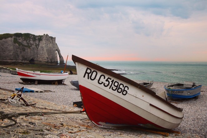Jag hittar fortfarande inte rätt klippa. Får mess från resten av familjen att de ser den nerifrån byn. Den måste vara synlig här uppifrån också, tänker jag och följer stigen uppåt. Går ut på en klippa och ser raukar, stranden, byn, andra vackra klippformationer, en kyrka högt upp på klippkanten på andra sidan byn, det lätt turkosa havet… Men ingen elefantklippa. Jag ger upp och går ner till de andra. Det visar sig att elefantklippan var den jag stod på. Inte för att den ser ut som en elefant heller. Den ska väl likna en snabel tänker jag, klippan som skymtas på sista bilden, bakom båtarna i hamnen. Men inte ens det håller jag med om. Kanske ska den ses från andra hållet? Men nåja. En utflykt blev det. Till två vackra platser längs Alabasterkusten. Även om det var en del förvecklingar på vägen. Och även om jag fortfarande inte vet vilken av dem som heter Falaise d’Aval egentligen. Om det var guideboken eller Google som hade fel.