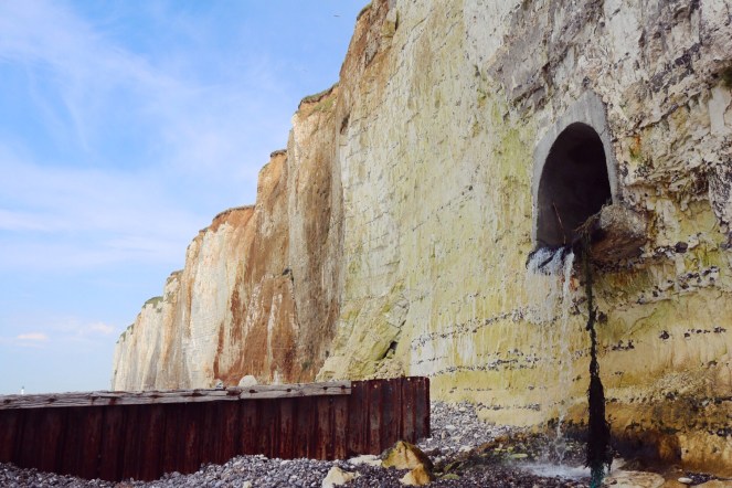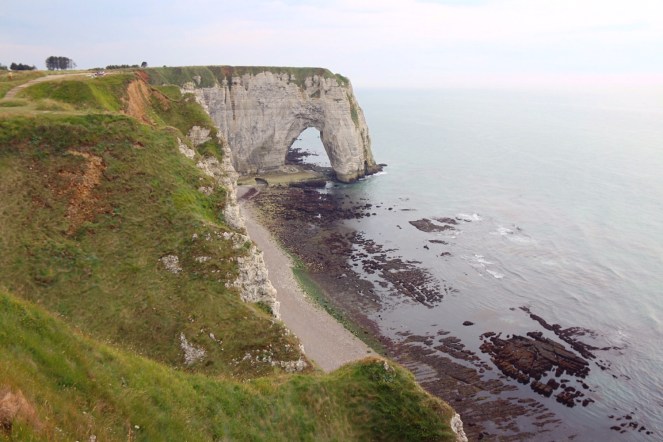 Inför dagens utflykt kollar jag i guideboken. Det är bok tjock som hela Frankrike. Om hela Frankrike. Den har sedan långt innan avresan fått några få invikta hörn. Det är jag som har vikt in dem när jag rekognoserade inför vår resa till Normandie, i norra Frankrike. En av de markerade sidorna är den där det står att läsa om motsvarigheten till Dovers vita klippor, men på denna sidan Engelska kanalen, Côte d’Albâtre. Eller Alabasterkusten som den heter på svenska. Det är en kust längs kalkstensplatån Pays de Caux, som ligger en bit bort, här i Normandie. Kusten sägs domineras av ljusa kalkstensklippor, som gett den dess namn. Klipporna är upp till 105 meter höga. Det är en 13 mil lång kuststräcka som ska vara belägen mellan utloppen för floderna Seine och Somme. Den största staden längs kusten är Dieppe. Klippornas kalksten avsattes på dinosauriernas tid, under Yngre krita.