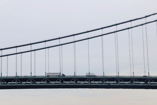 Båten går från Pier 11, som ligger på södra Manhattans östra strand, ungefär mitt mellan halvöns södra spets och Brooklynbron. Jag köper fyra biljetter i en automat. 11 dollar kostar de tillsammans. Vi får inte sittplats uppe på däck men jag och min sambo Anders sätter oss tillsammans med ett par andra turister på en låda med flytvästar. Om det är tillåtet vet jag inte. Men det fungerar. Våra pojkar väljer sittplats inomhus, på nedre däck. Uppe hos oss är fartvinden ljum.