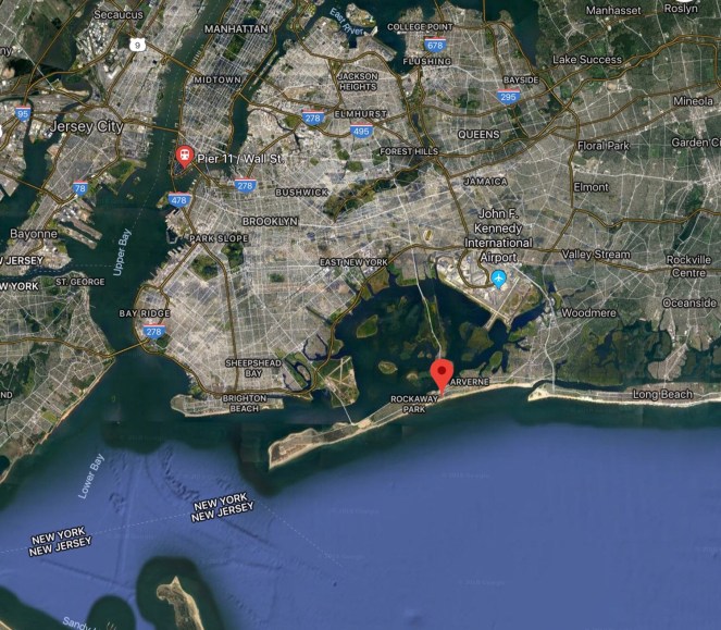 Det är en måndag i slutet av juli månad. Termometrarna på Manhattan visar mest obegripliga Fahrenheit, men en och annan visar också 28 grader Celsius. Det är soldis. Vi har beslutat oss för att ta båten ut till Rockaway för att bada. Och tunnelbanan tillbaka till Manhattan.