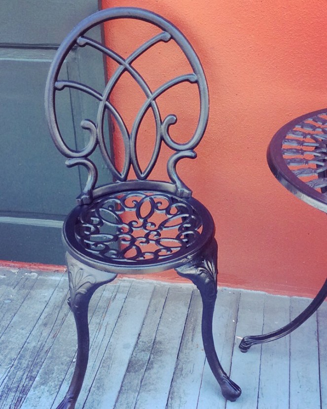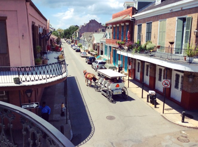 Jag sitter insvept i badhandduken vi köpte på Rockaway Beach, New York. Just nu sitter jag på verandan utanför hotellrummet. Verandan löper runt hela andra våningen på hotellet. Ljudet från ett byggarbete i närheten. Annars är det lugnt i den här delen av de franska kvarteren. En och annan bil kör förbi. Då och då ljudet av hovar som kloppittikloppar mot den slitna asfalten. Snart tjuter kanske en tågvissla.
