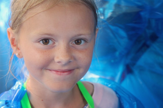 På väg in i hissen ger han oss rådet att vänta med att ta på de blå regnkappor vi får där nere tills vi går ombord på båten. Det kan bli varmt att stå och vänta med dem på. Och vi får också rådet att inte gå upp på båtens övre däck utan istället stanna på nedre däckets vänstra sida där vi kommer att få se de bästa vyerna.