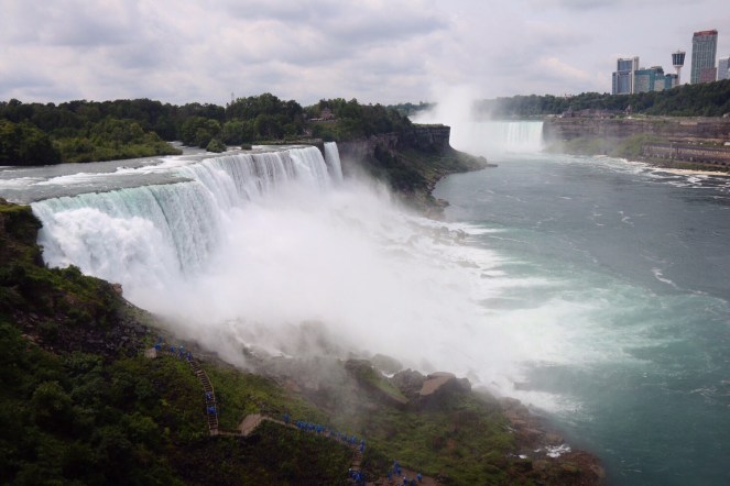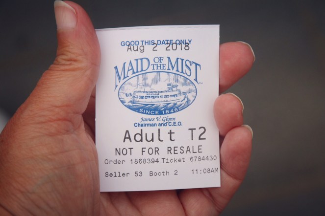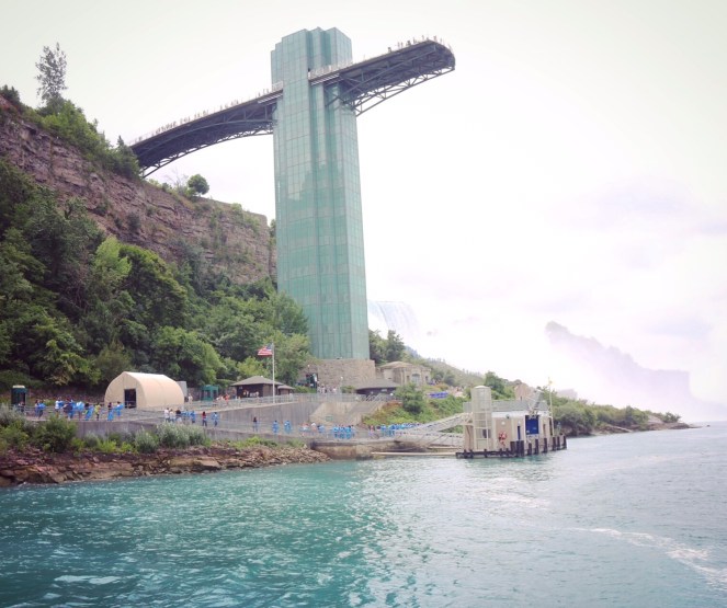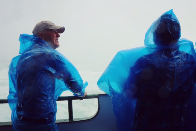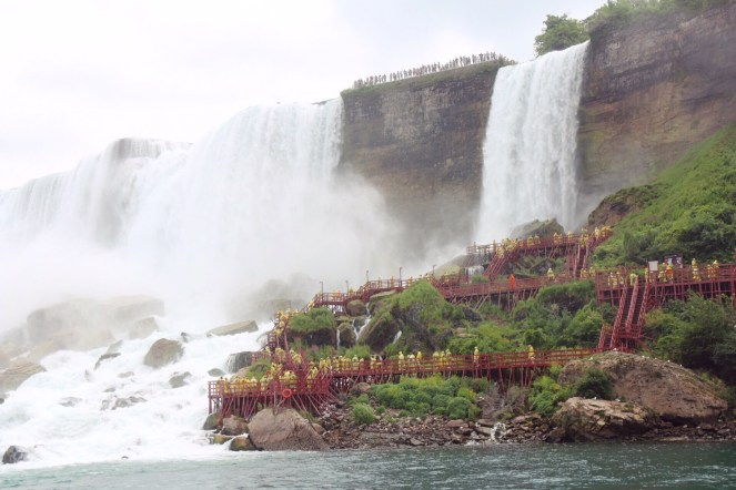 Den första glimt vi får av de berömda vattenfallen är vyerna på vår vänstra sida när vi promenerar över gångbron till den hiss som ska ta oss ner till Maid of the Mist, båten vi ska åka med till Niagarafallen. Utsikten är hänförande trots gråvädret. Men vår guide manar på oss. Vi ska inte stanna och fotografera nu. Det blir det tillfälle till senare. Nu ska vi skynda oss ner innan det hinner bli några köer.