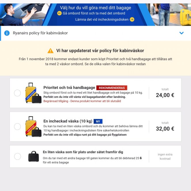 Jag hade egentligen lovat mig själv att aldrig mer boka flyg med Ryanair efter en resa med familjen från Nyköping till Algarve för sex år sedan. Det huvudsakliga skälet var att jag nästan bröt ihop på deras bokningssida: Ett enda långt sicksackspår av att välja bort mer eller mindre dyra tillval som jag inte ville ha och att välja till att få ta med sig en incheckad väska för hela familjen. Och detta tog så lång tid att jag blev utslängd ett par gånger på grund av ”timeout” innan jag lyckades trycka igenom allt. Och då hade jag av misstag köpt till val av säten som på den tiden var ett alldeles onödigt tillval.