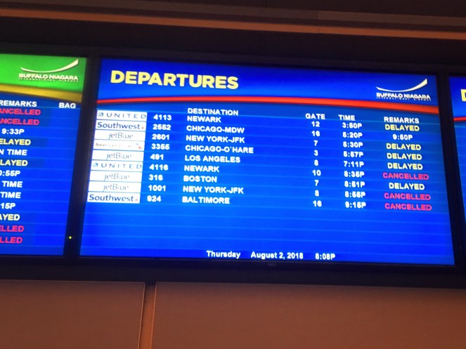 Vi går till bildskärmarna med information om avgående flyg. Det är min sambo Anders som upptäcker det först: ”Cancelled”, säger han. ”Nej, du skojar”, säger vi andra i mun på varandra. Men han skojar inte. Och det är inte bara vårt flyg som är inställt. Samtliga flyg från Buffalo till flygplatserna runt New York City är inställda. Vad kan ha hänt? Vad gör vi nu?